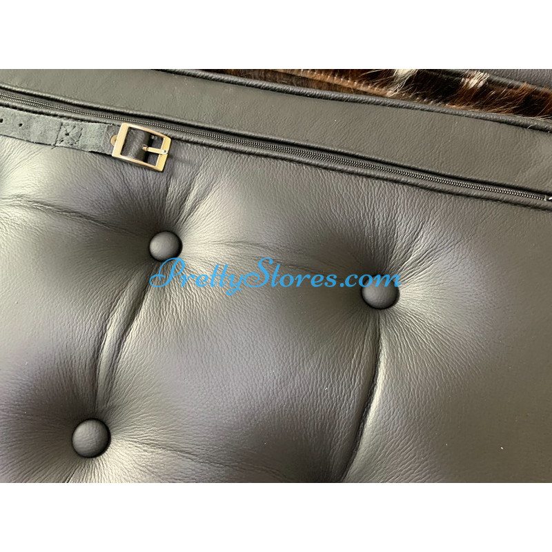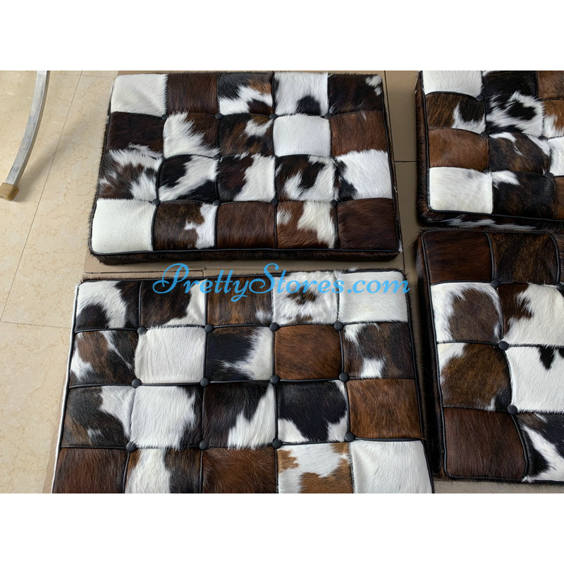 Barcelona style Chair in Tri-Color Pony Skin Leather, and buyers can choose different patterns of the leather for which you need to contact us to get the pictures. The Cushions are made of Tri-Color Pony Skin Leather in Luxury grade: Using Tri-Color Pony Skin Leather on front, 4 sides and PU leather on the back,extra cost needed if using the Real leather or cowhide leather on the back too. Other 5 Grades of different leather are also available the detail of which you can click the links in the description below to get. The frame is made of solid stainless steel with a loading capacity of more than 300kg and each foot is with plastic foot protector. The frame straps are made of high quality composite leather which can last for at least 5-10 years. The regular dimension of Barcelona Chair is 74(W)*83(D)*78(H)cm which is around 29(L)*33(W)*31(H) inches.We can also customize any size upon your request.