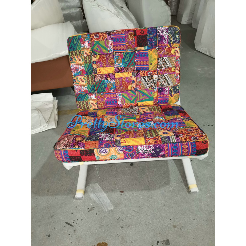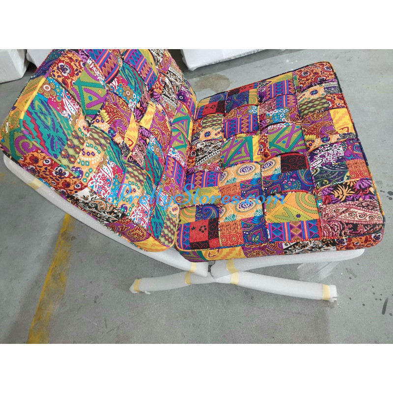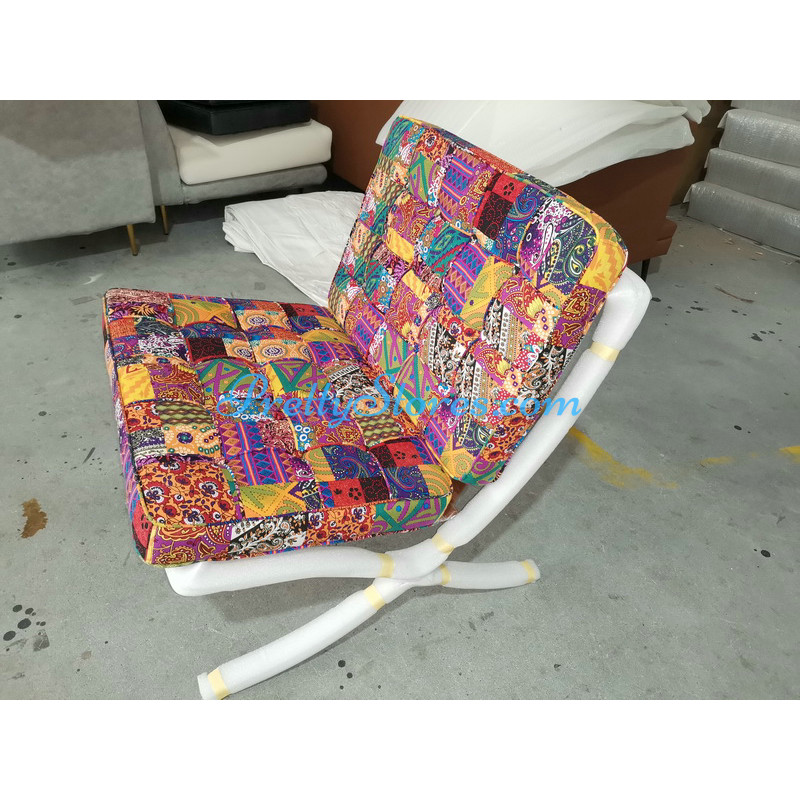 Barcelona style Chair in Print Fabric. The Cushions are made of Print Fabric which is not animal leather and especially popular with vegan users. Other 6 Grades of different leather are also available the detail of which you can click the links in the description below to get. The frame is made of solid stainless steel with a loading capacity of more than 300kg and each foot is with plastic foot protector. The frame straps are made of high quality composite leather which can last for at least 5-10 years. The regular dimension of Barcelona Chair is 74(W)*83(D)*78(H)cm which is around 29(L)*33(W)*31(H) inches. Ottoman is optional, size is 60(W)*55(D)*43(H)cm which is around 24(L)*22(W)*17(H) inches. We can also customize any size upon your request.