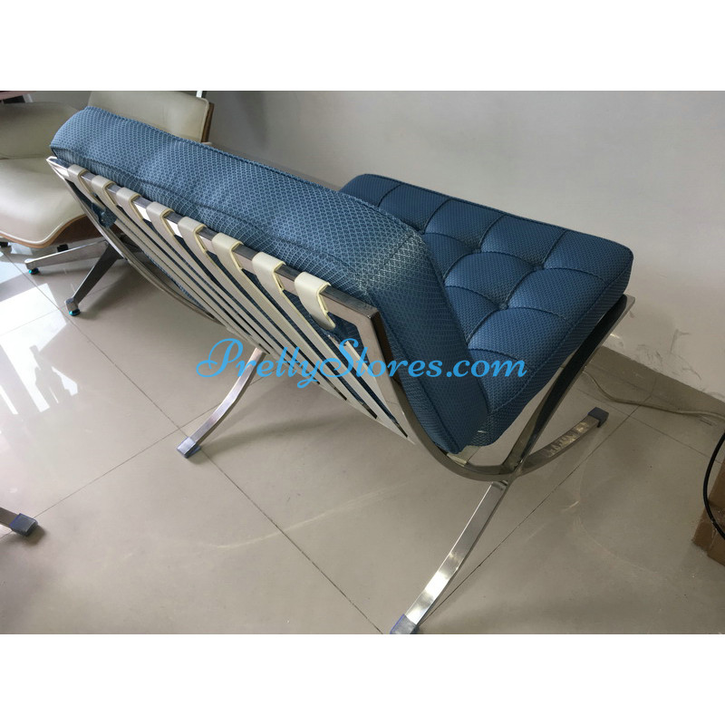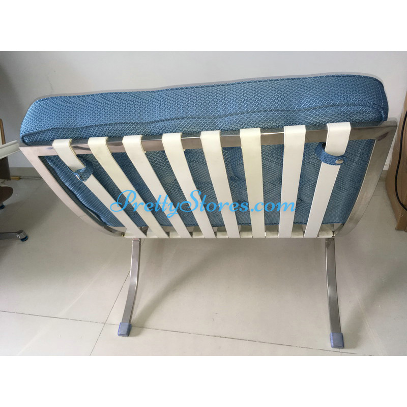 Barcelona Chair in Blue Rhombic Fabric. The Cushions are made of Rhombic Fabric which is not animal leather and especially popular with vegan users. The frame is made of solid stainless steel with a loading capacity of more than 300kg and each foot is with plastic foot protector. The frame straps are made of high quality composite leather which can last for at least 5-10 years. The regular dimension of Barcelona Chair is 74(W)*83(D)*78(H)cm which is around 29(L)*33(W)*31(H) inches. Ottoman is optional,size is 60(W)*55(D)*43(H)cm which is around 24(L)*22(W)*17(H) inches. We can also customize any size upon your request.Please be noted, the default quantity is set to be 2pcs, because our products are mostly sold to business buyers, so based on the commercial standard our package is designed for 2pcs during shipping. If you only need 1pcs, you can specify the situation in checkout and we will count the exact amount based on your shipping address and refund the part for 1pcs under your confirmation.