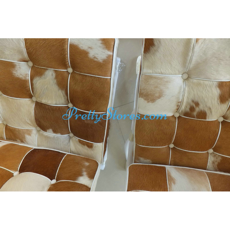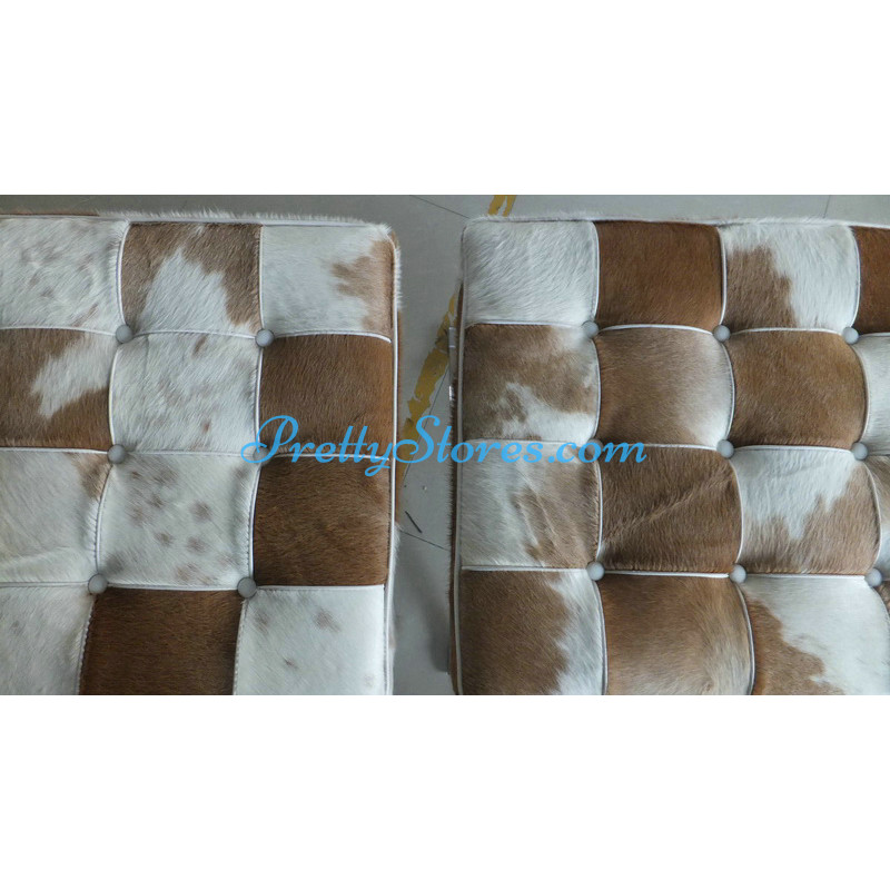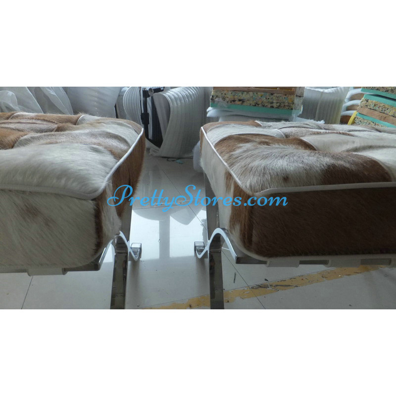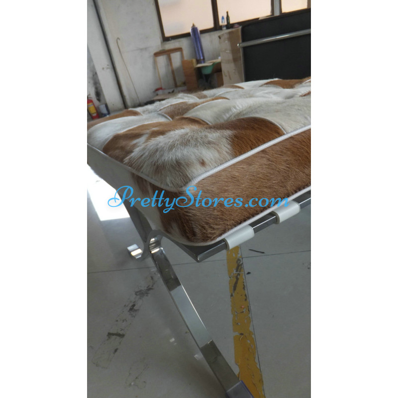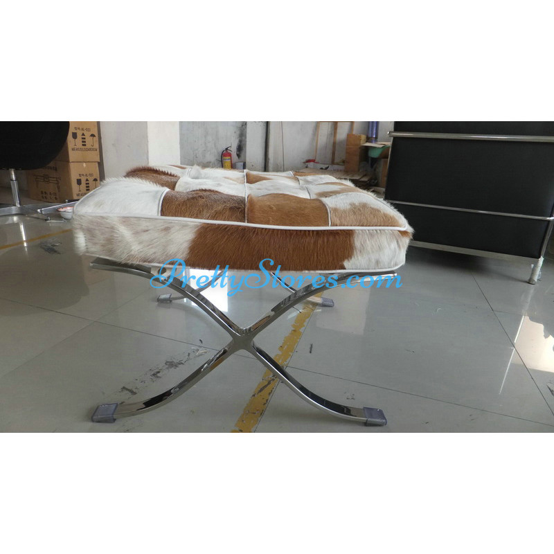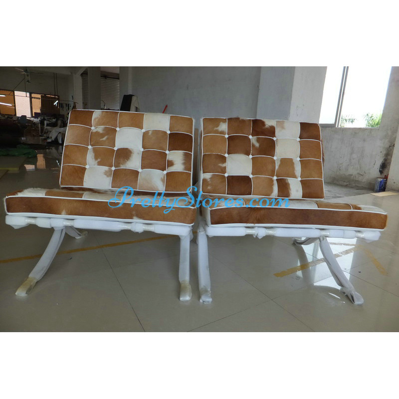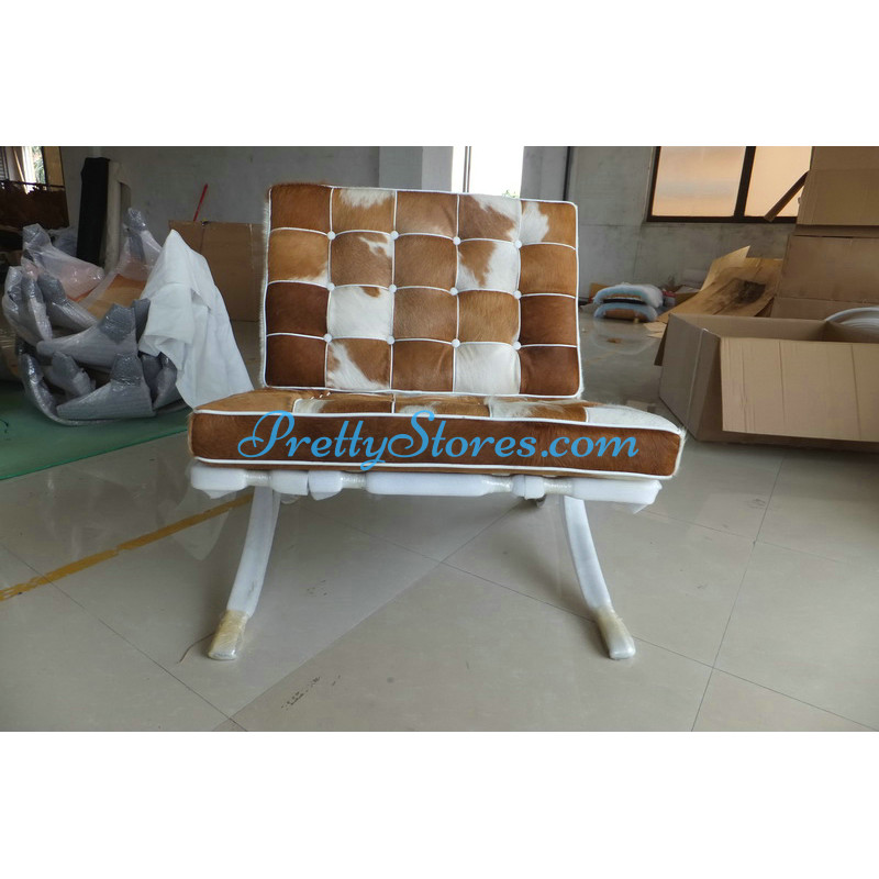 Barcelona style Chair in Pony Skin Leather, and buyers can choose different patterns of the leather for which you need to contact us to get the pictures. The Cushions are made of Pony Skin Leather in Luxury grade: Using Pony Skin Leather on front, 4 sides and PU leather on the back,extra cost needed if using the Real leather or cowhide leather on the back too. Other 6 Grades of different leather are also available the detail of which you can click the links in the description below to get. The frame is made of solid stainless steel with a loading capacity of more than 300kg and each foot is with plastic foot protector. The frame straps are made of high quality composite leather which can last for at least 5-10 years. The regular dimension of Barcelona Chair is 74(W)*83(D)*78(H)cm which is around 29(L)*33(W)*31(H) inches.We can also customize any size upon your request.
