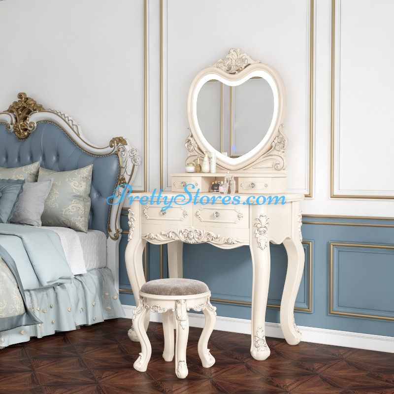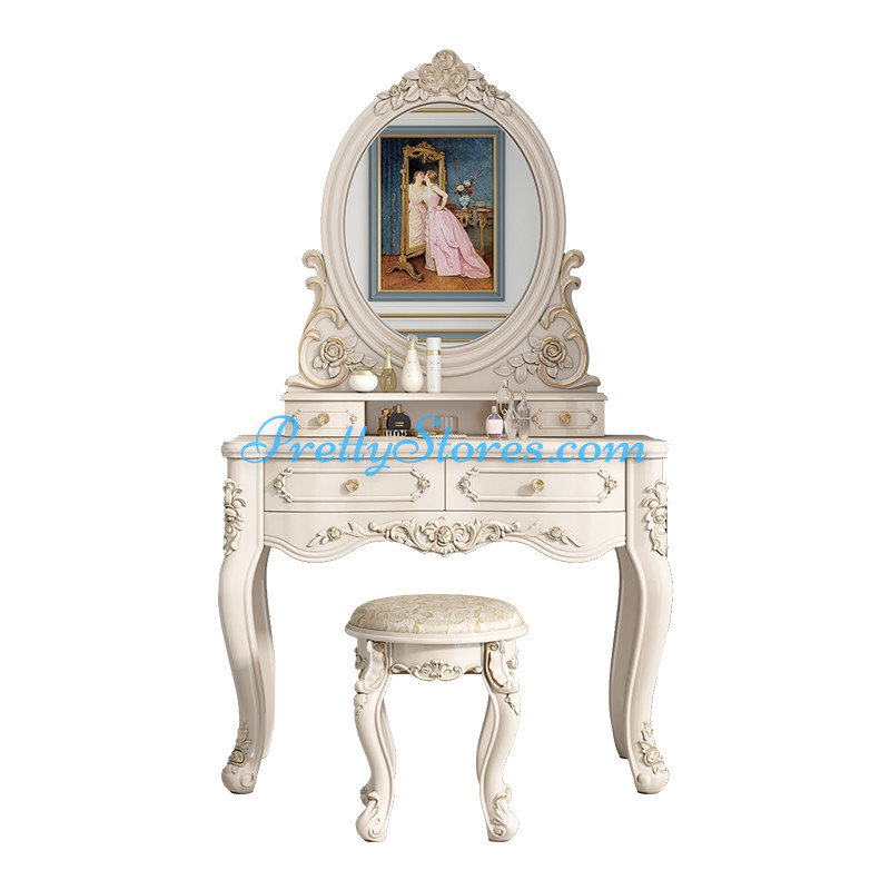 This European dressing table is perfect for any bedroom, no matter the size. Available in a range of sizes from 60 cm to 100 cm, it comes in ivory white round or oval mirrors and has a luxurious royal crown mirror with a matching bench seat. This multi-functional modern and elegant dressing table also offers a choice of intelligent, soft-lit mirrors for an even more luxurious experience. With a solid wood structure and exquisite craftsmanship, the ivory white colour of this dressing table will add a touch of sophistication to any bedroom.Please be noted, our websites are under mass upgrading and the specification above was initially made by AI and will be gradually refined by humans.Thus, you may see some mistakes,or some elements will be adjusted later after your first viewing. Please feel free to contact us to get a confirmation of the product's specifications first before you place the order. And there is a chance your order may be canceled without checking first due to some inaccurate information in the specification. But please don't worry, we will double check with you after your order and only charge after your full confirmation, and if your order needs to be canceled, we will compensate you with a discount coupon. Thank you very much for all your support and attention.