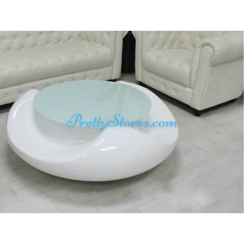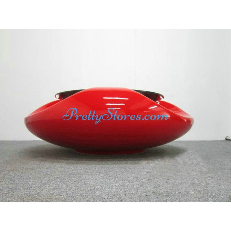 Designed like an UFO. Material: fiberglass and tempered glass. Size:120*120*40cm.The base color can be red, wine red or white. The glass color can be clear, black.