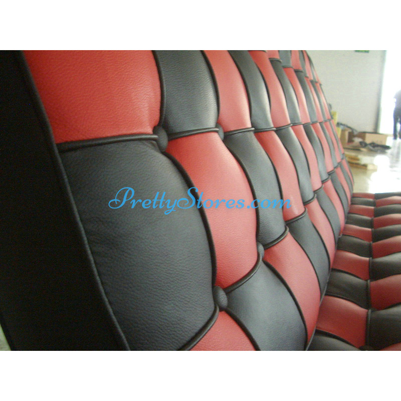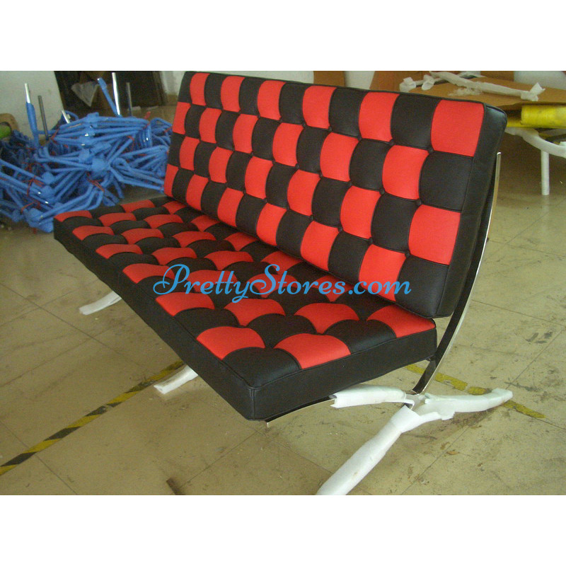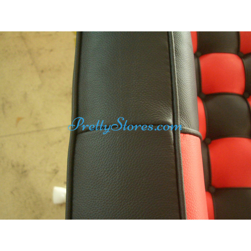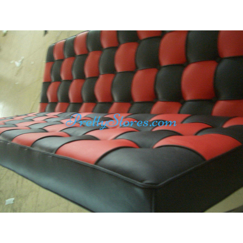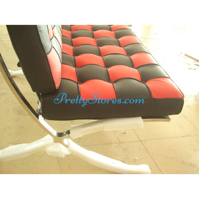 Barcelona style Loveseat Two Seaters Sofa in Italian Leather in Black and Red mix color. The Cushions are made of Italian Leather in Standard grade: Using Italian leather on the front while PU Leather on the back. Other 6 Grades of different leather are also available the detail of which you can click the links in the description below to get. The frame is made of solid stainless steel with a loading capacity of more than 300kg and each foot is with plastic foot protector. The frame straps are made of high quality composite leather which can last for at least 5-10 years. The regular dimension of Barcelona Loveseat is 150(L)*75(W)*75(H)cm which is around 59(L)*30(W)*30(H) inches.