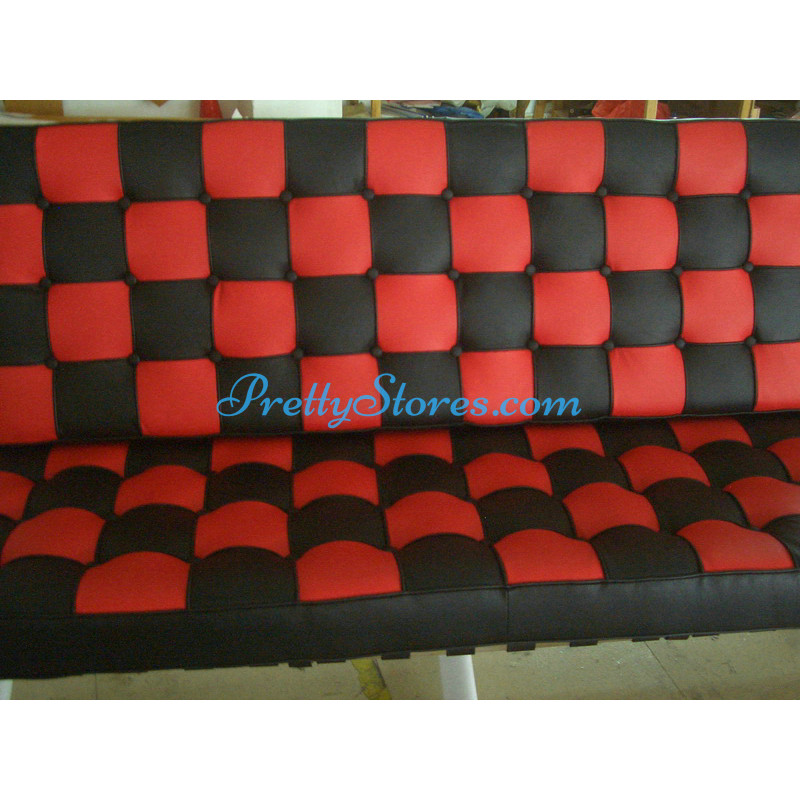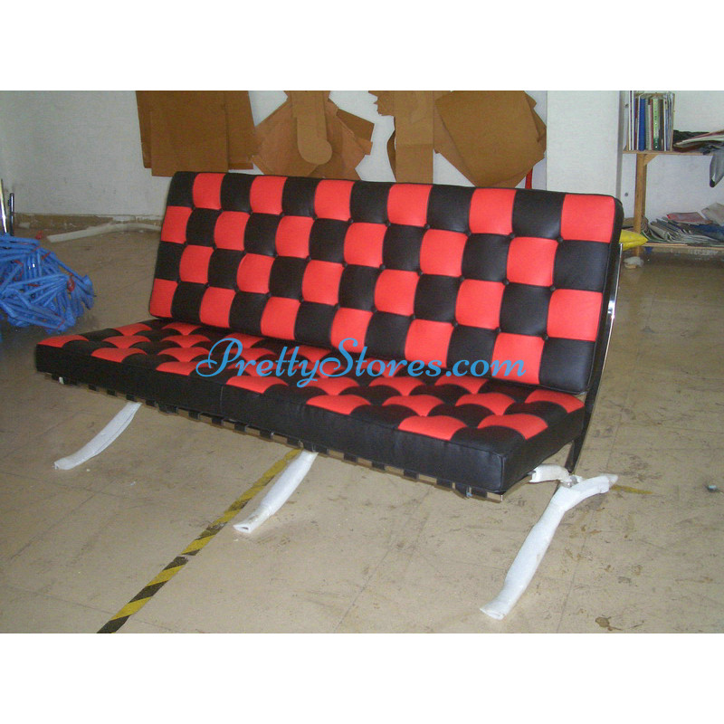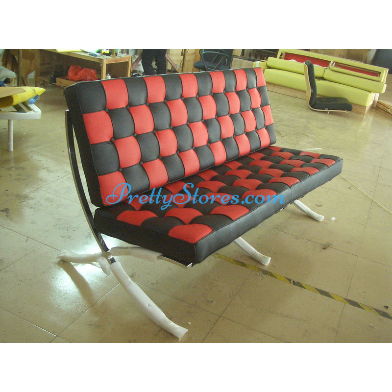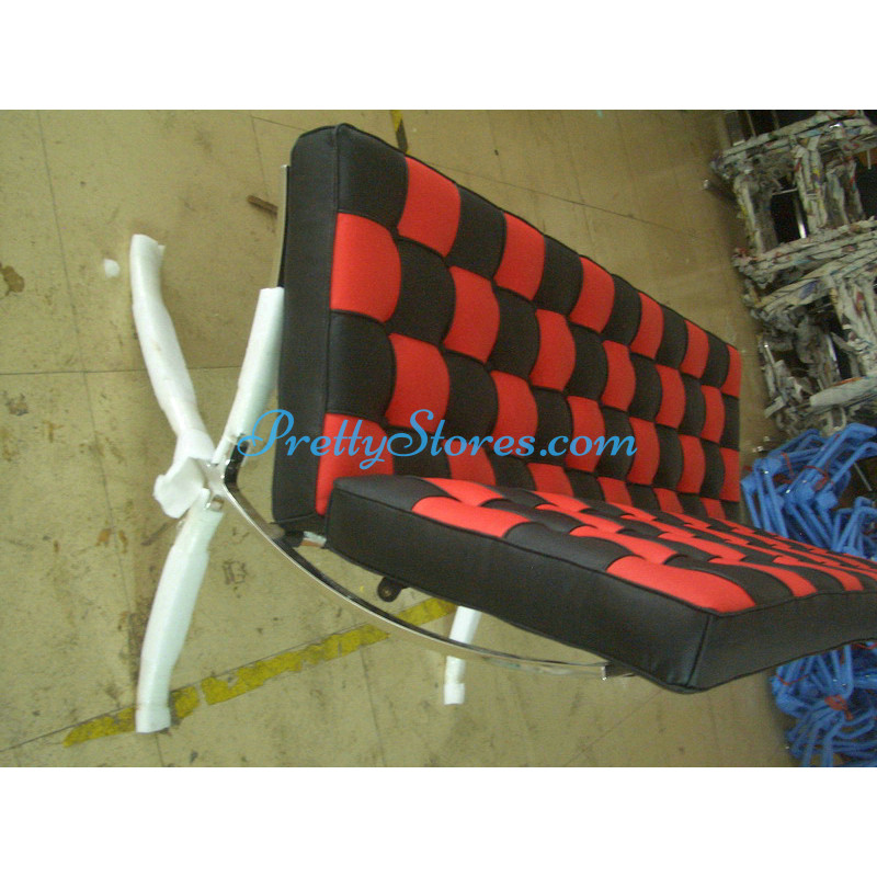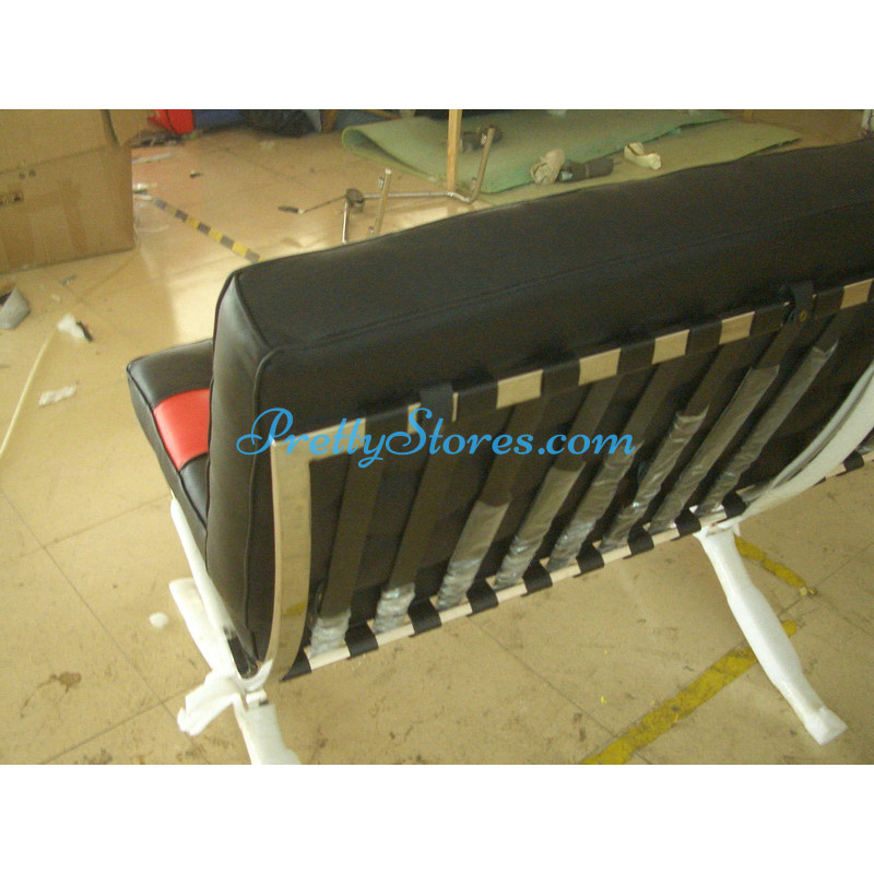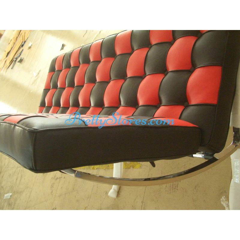 Barcelona style Loveseat Two Seaters Sofa in Italian Leather in Black and Red mix color. The Cushions are made of Italian Leather in Standard grade: Using Italian leather on the front while PU Leather on the back. Other 6 Grades of different leather are also available the detail of which you can click the links in the description below to get. The frame is made of solid stainless steel with a loading capacity of more than 300kg and each foot is with plastic foot protector. The frame straps are made of high quality composite leather which can last for at least 5-10 years. The regular dimension of Barcelona Loveseat is 150(L)*75(W)*75(H)cm which is around 59(L)*30(W)*30(H) inches.