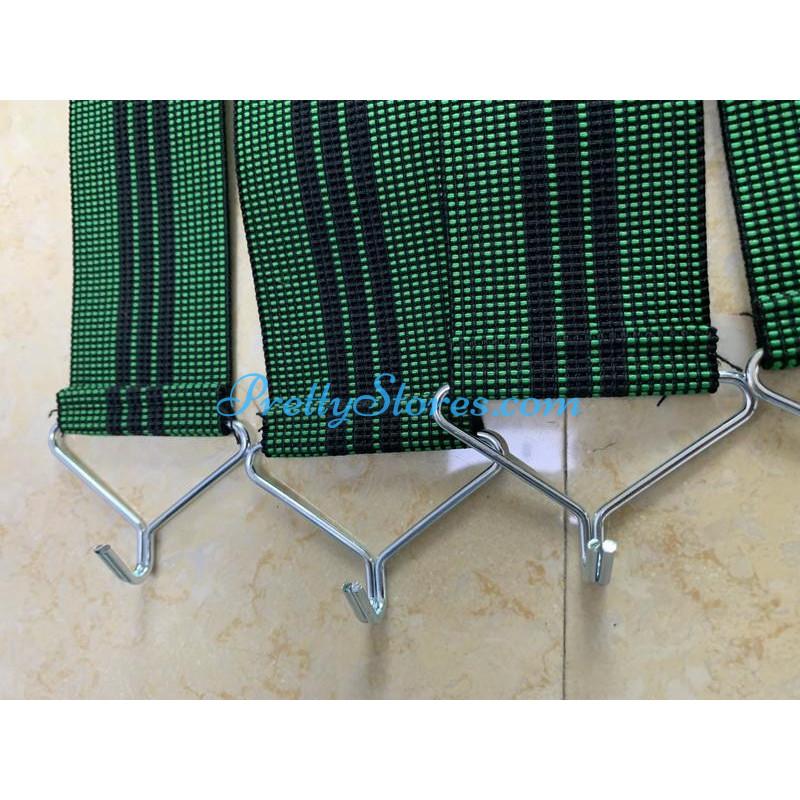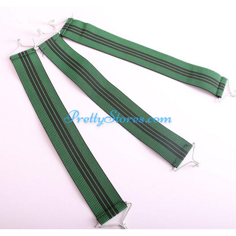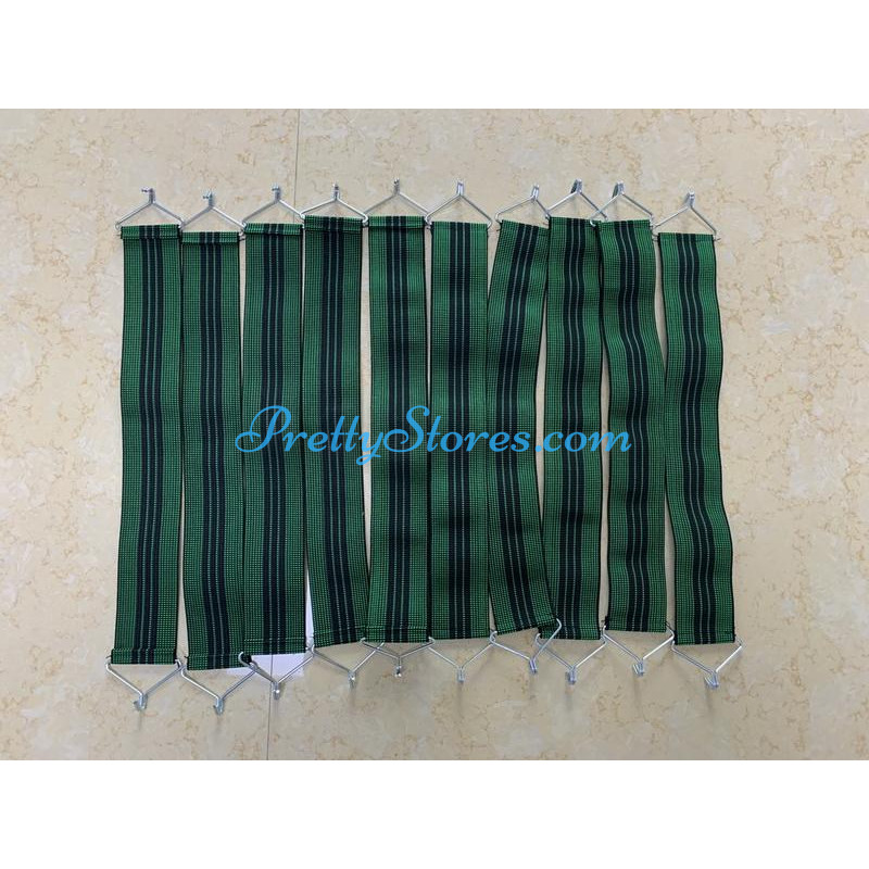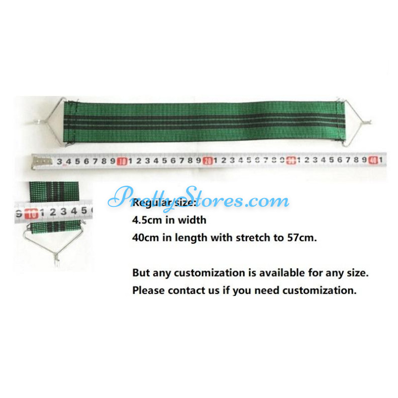 Repair Replacement Straps for Le Corbusier Style L4 Chaise Lounge Chair,with single hook. The core is made of high quality rubber shirr, wrapped by double-strand nylon webbings. Distinct from the normal elastic band, a single strap can load the weight of as much as 100kg. The price is for a set containing 10pcs straps. Regular size for each strap is 4.5cm in width, and 40cm in total length with the most stretch to 57cm. The hook is with 2mm for each wire diameter and around 5mm as total diameter. But we can customize with hook and straps of different sizes upon your special request at extra cost for customization. Regular color is just as green in the picture, other colors are available for customization.