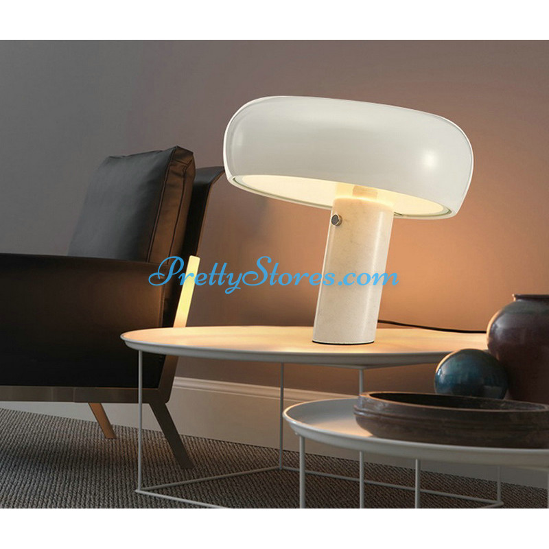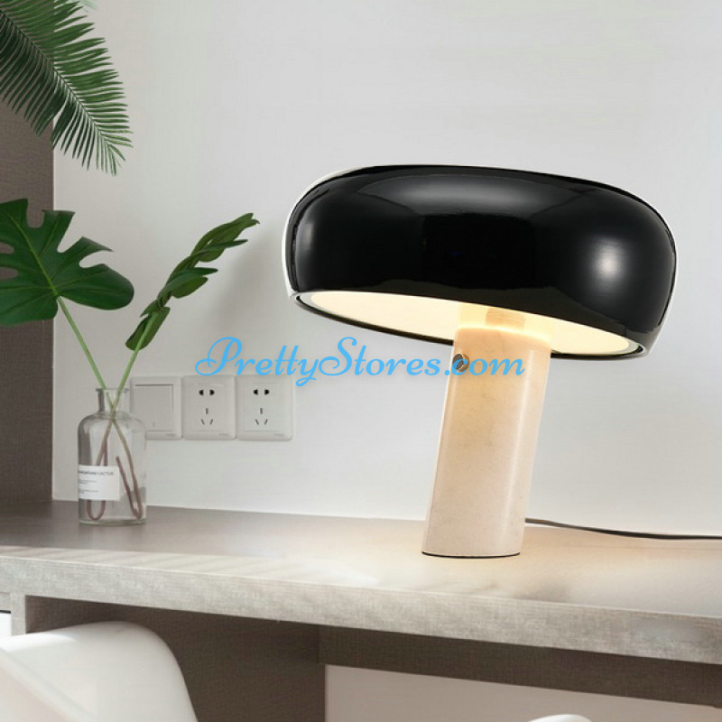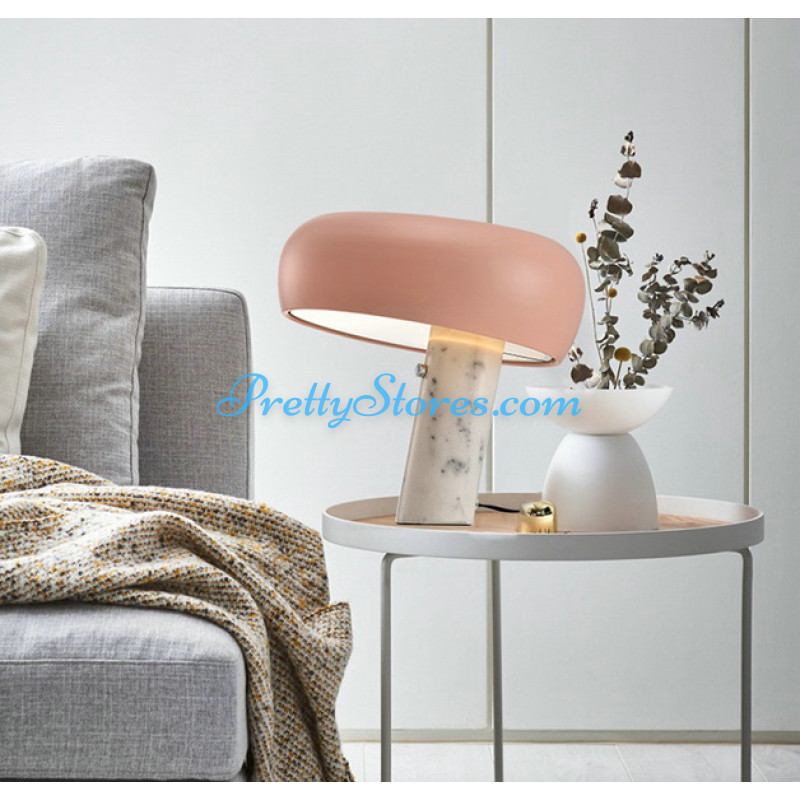 Made of marble and resin shade. There are two sizes available. Small size: D28*H26cm. Large size:D40*H38cm. 5 colors are available: white, black, pink, yellow, green.You can also view the video of this lamp on: https://www.youtube.com/watch?v=PRNKEbL4zQU